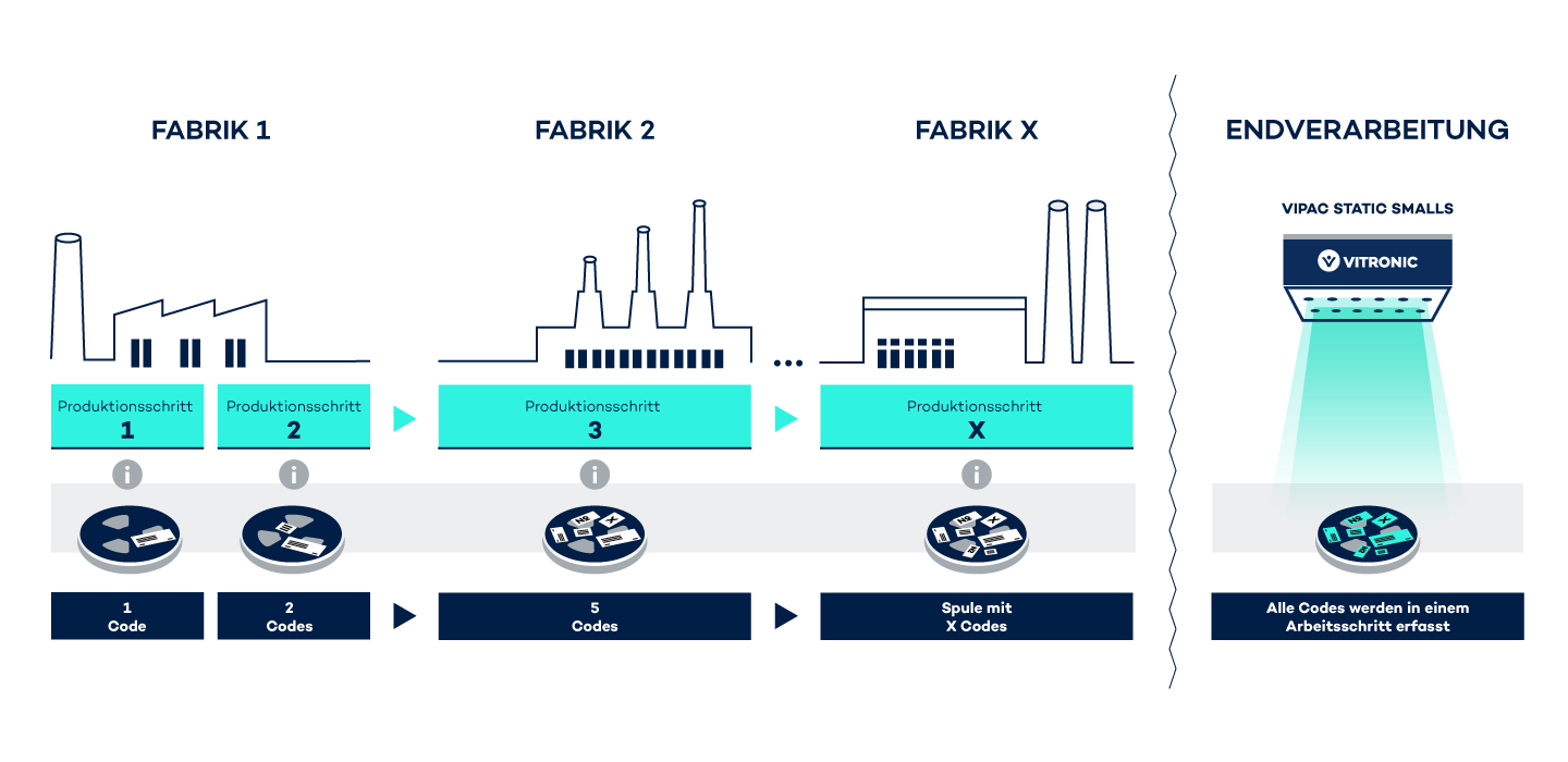 Die Geräte müssen alle Daten auf einmal erfassen und dabei selbst kleine, farbige, schlecht gedruckte oder beschädigte Codes problemlos lesen können. Wichtig ist, dass alle Informationen auf einem Objekt schnell und zuverlässig in nur einem Durchgang automatisch erfasst werden. Das Ziel ist maximaler Durchsatz, sichere Archivierung und lückenlose Rückverfolgung, um allen gesetzlichen Vorgaben nachzukommen und die vom Lieferkettensorgfaltspflichtengesetz geforderten Informationen schnell abrufen zu können.