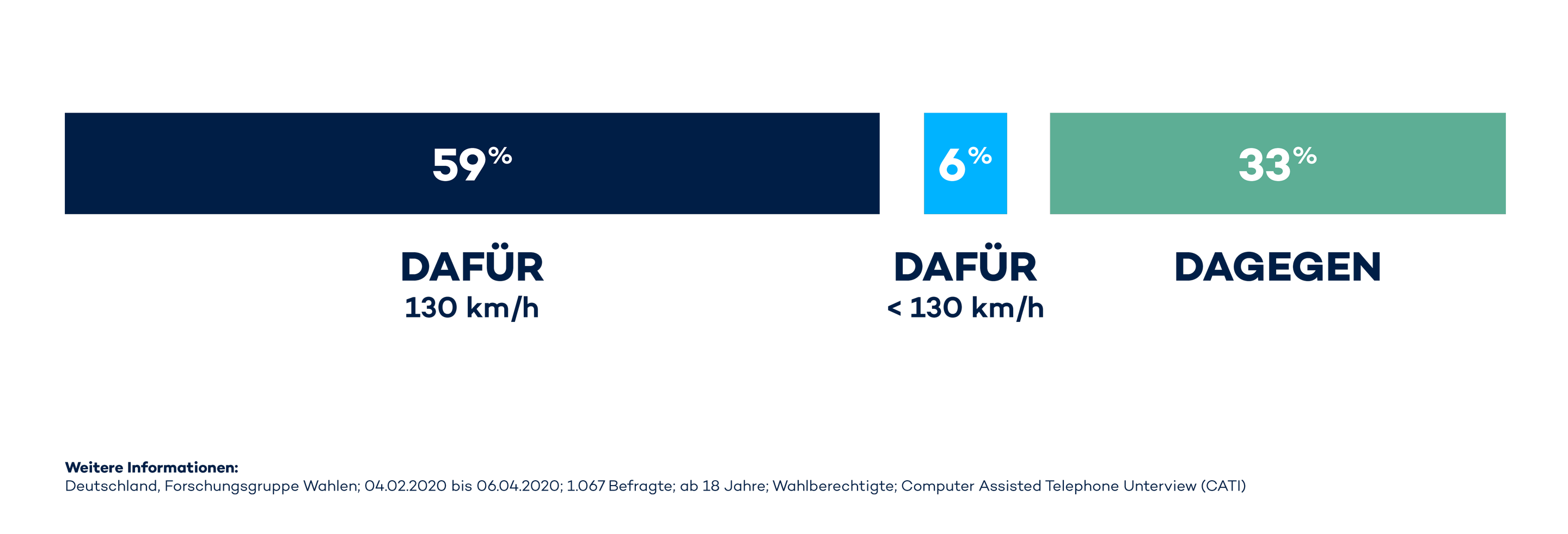 Und gefühlig geht es auch im Bereich der Akzeptanz von Tempolimits weiter. Entgegen der landläufigen Auffassung, dass Fahren Freiheit bedeutet, die nicht eingeschränkt werden sollte, votieren laut Umfrage des ZDF Politbaromters 59 Prozent der Befragten für ein Tempolimit von 130 km/h auf Autobahnen. Sechs Prozent waren für eine Geschwindigkeitsbeschränkung von weniger als 130 km/h. Lediglich einer von drei Befragten lehnte damit ein Tempolimit rigoros ab.