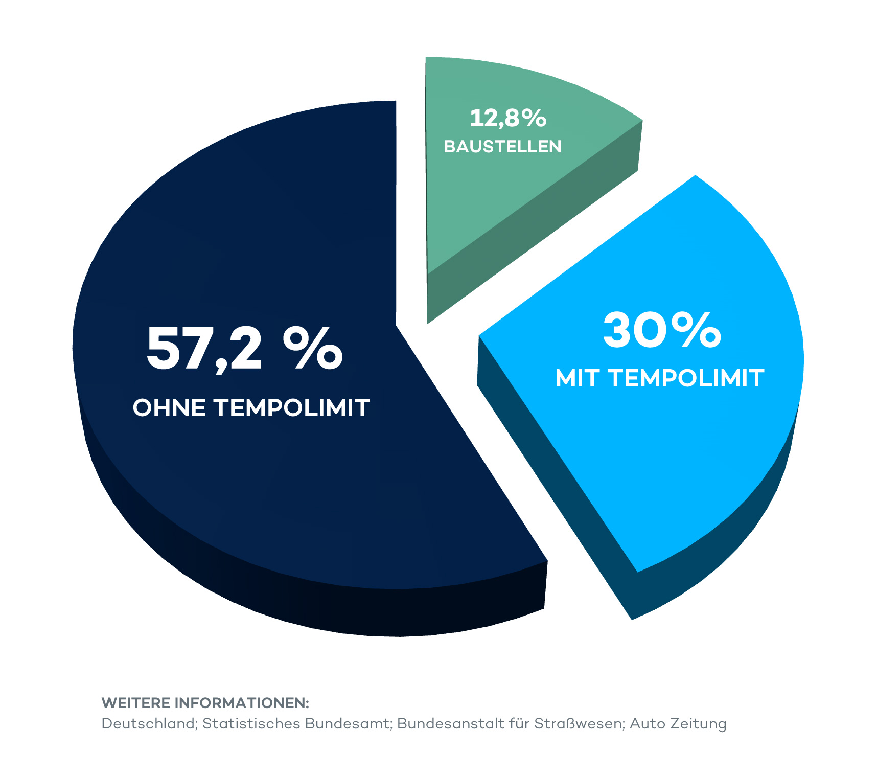 Bei der Diskussion um Tempolimits auf Autobahnen wird immer wieder geäußert, dass es sowieso immer weniger Strecken ohne Geschwindigkeitsbeschränkungen gibt. Aber stimmt das überhaupt? Im Betrachtungszeitraum Januar 2019 existierte auf rund 57 Prozent der Autobahnkilometer in Deutschland kein Tempolimit. Ein nur vorübergehendes Tempolimit aufgrund von Bauarbeiten gab es auf rund 13 Prozent dieser Straßen. Also machten Streckenabschnitte mit einem Tempolimit gerade einmal 30 Prozent der Autobahnkilometer in Deutschland aus. Viele Argumente gegen ein generelles Tempolimit beruhen auf dem Gefühl, dass die eingeschränkten Streckenabschnitte bereits heute klar dominieren. Das ist nicht so.