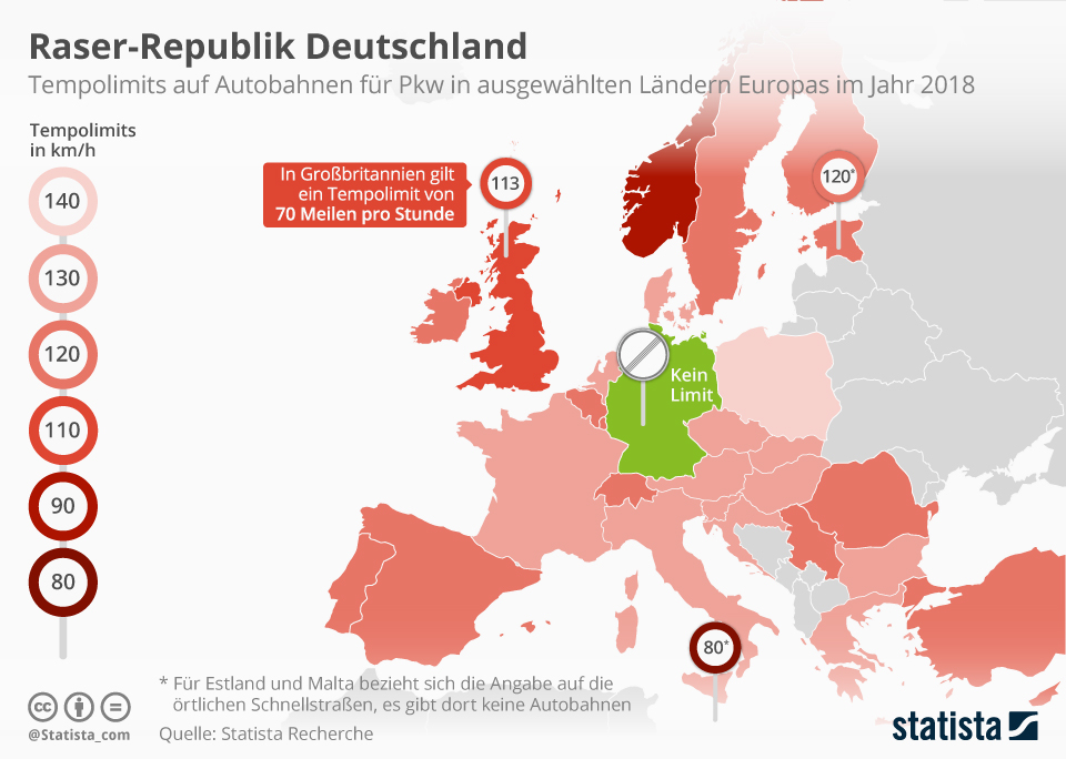 Dabei ist Deutschland das einzige europäische Land, in dem auf Autobahnen kein generelles Tempolimit existiert. Wie die Infografik von Statista zeigt, gibt es in anderen europäischen Ländern eine Geschwindigkeitsbeschränkung von 120 bzw. 130 km/h. Geringer ist die erlaubte Geschwindigkeit sogar noch in Großbritannien (112 km/h), Malta (80 km/h auf Schnellstraßen), Norwegen (90 km/h) und Zypern (110 km/h)