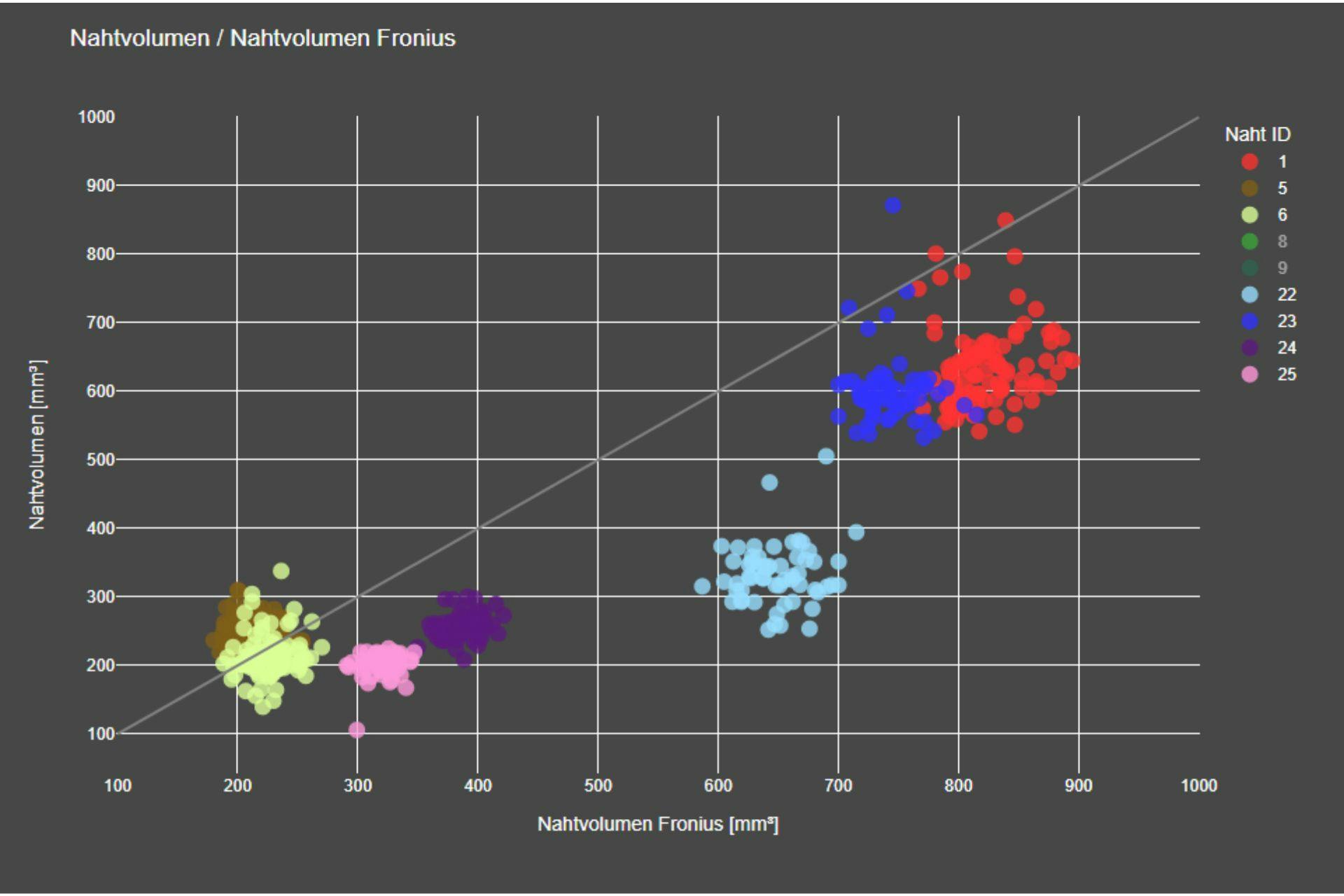 Im unten dargestellten Beispiel werden zwei Werte für mehrere Nähte verglichen: Das aus dem Drahtvorschub berechnete Nahtvolumen und die gemessenen 3D-Daten der Naht. Große Streuungen gleichfarbiger Punkte deuten hier darauf hin, dass das Schweißgut in einen Spalt läuft.