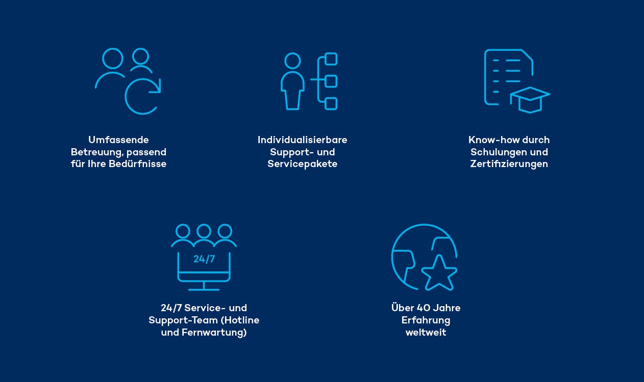 Lifetime-Service bedeutet für uns, dass wir Ihnen von Anfang an zur Seite stehen. Darum beginnen unsere Serviceleistungen nicht erst bei der Installation unserer Systeme, sondern schon in der Projektplanung Ihrer Anwendung. Gerne unterstützen wir Sie bei der Analyse Ihrer Anforderungen, internen Abläufen sowie Spezifikationen und finden die für Sie beste Lösung.
