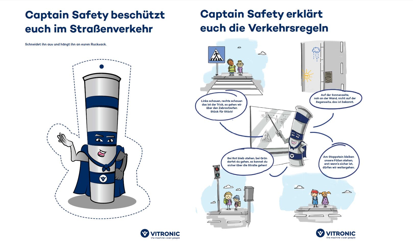 Sicher zur Schule – Auch in der Broschüre „Sicher zur Schule“ tritt Captain Safety auf und erklärt den Kleinsten auf einfache Art & Weise Verkehrsregeln im Straßenverkehr.