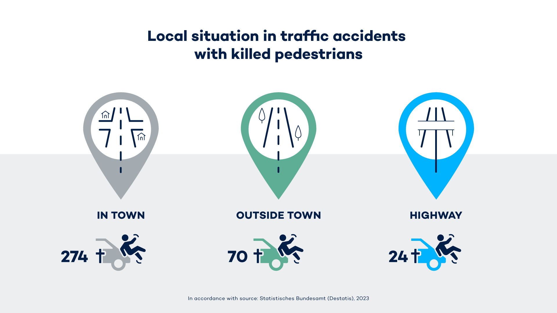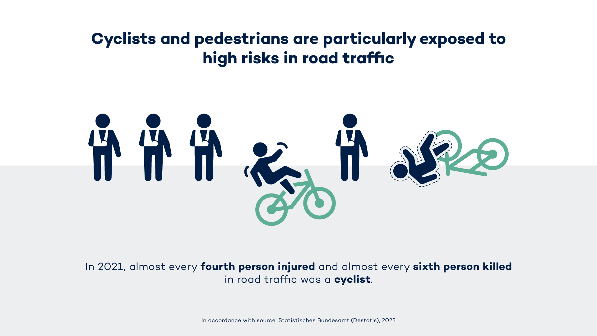About half of the people killed and seriously injured in road traffic are vulnerable road users. In cities, this figure is as high as 70 percent. According to surveys by the German Federal Statistical Office, a total of 4,651 pedestrians were seriously injured in 2021 in Germany; more than 343 were killed. Crosswalks and pedestrian crossings are particularly dangerous points. There were more than 10,000 accidents at these traffic points. But it is not only pedestrians who need to be better protected—cyclists are particularly at risk. According to the Federal Statistical Office, a total of almost 98,000 cyclists were injured and 474 killed in 2021.