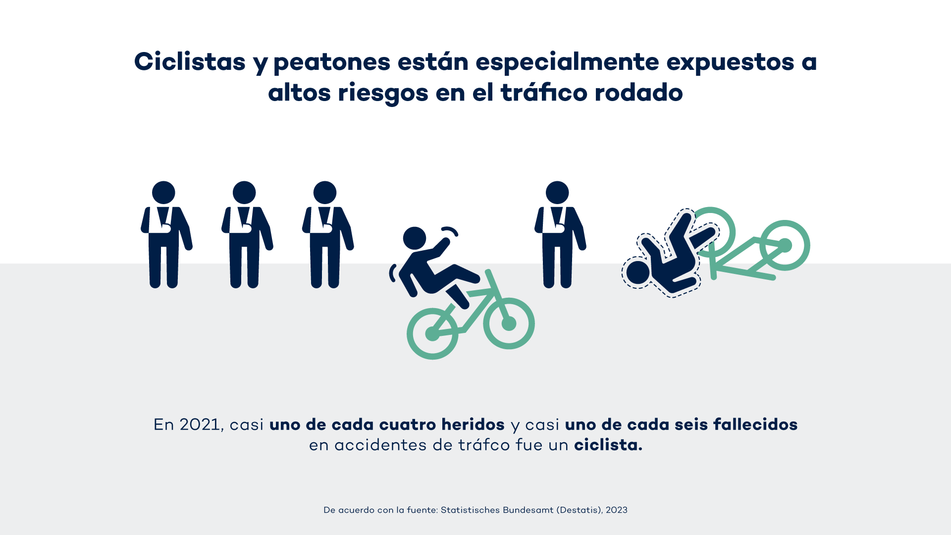 Cerca de la mitad de las personas que pierden la vida o sufren heridas graves a causa del tráfico rodado son usuarios vulnerables de las carreteras. En las ciudades, esta cifra puede llegar a ser del 70 %. Según las encuestas realizadas por la Oficina Federal de Estadística de Alemania, un total de 4651 peatones sufrieron heridas de gravedad en 2021 en Alemania; más de 343 perdieron la vida. Los pasos de peatones son puntos especialmente peligrosos. Se registraron más de 10.000 accidentes en estos puntos. Pero no solo hay que proteger a los peatones; los ciclistas también están expuestos a riesgos. Según la Oficina Federal de Estadística, un total de casi 98.000 ciclistas sufrieron algún accidente y 474 perdieron la vida en 2021.