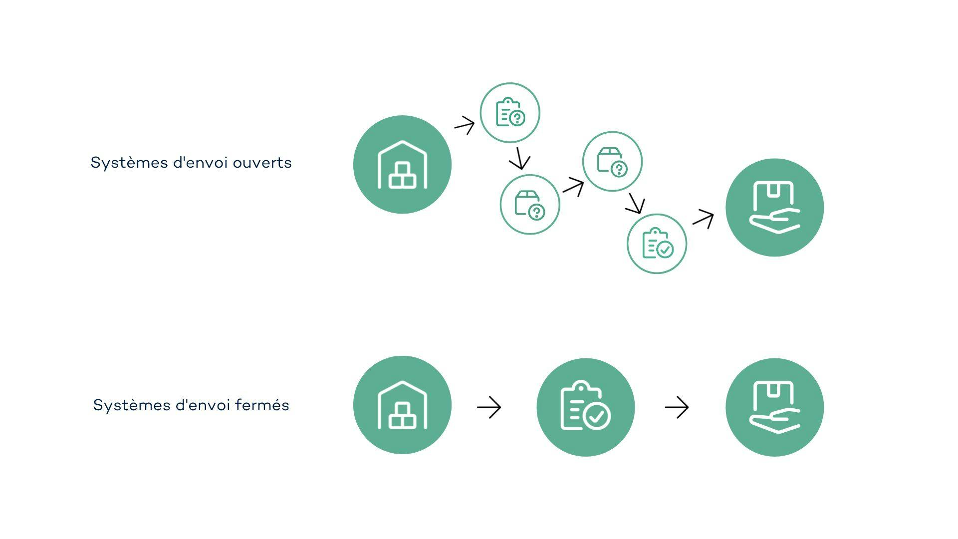 Les défis posés par les envois transfrontaliers sont étroitement liés au type de système d'envoi utilisé. Généralement, les systèmes ouverts sont utilisés dans le transport de biens issus du commerce en ligne international. Dans ces types de systèmes, les services de livraison de colis impliqués sont indépendants les uns des autres. Cela signifie qu'il n'y a pas d'étiquettes d'envoi standardisées, de codes de suivi ou d'emballages pouvant être triés par les machines.