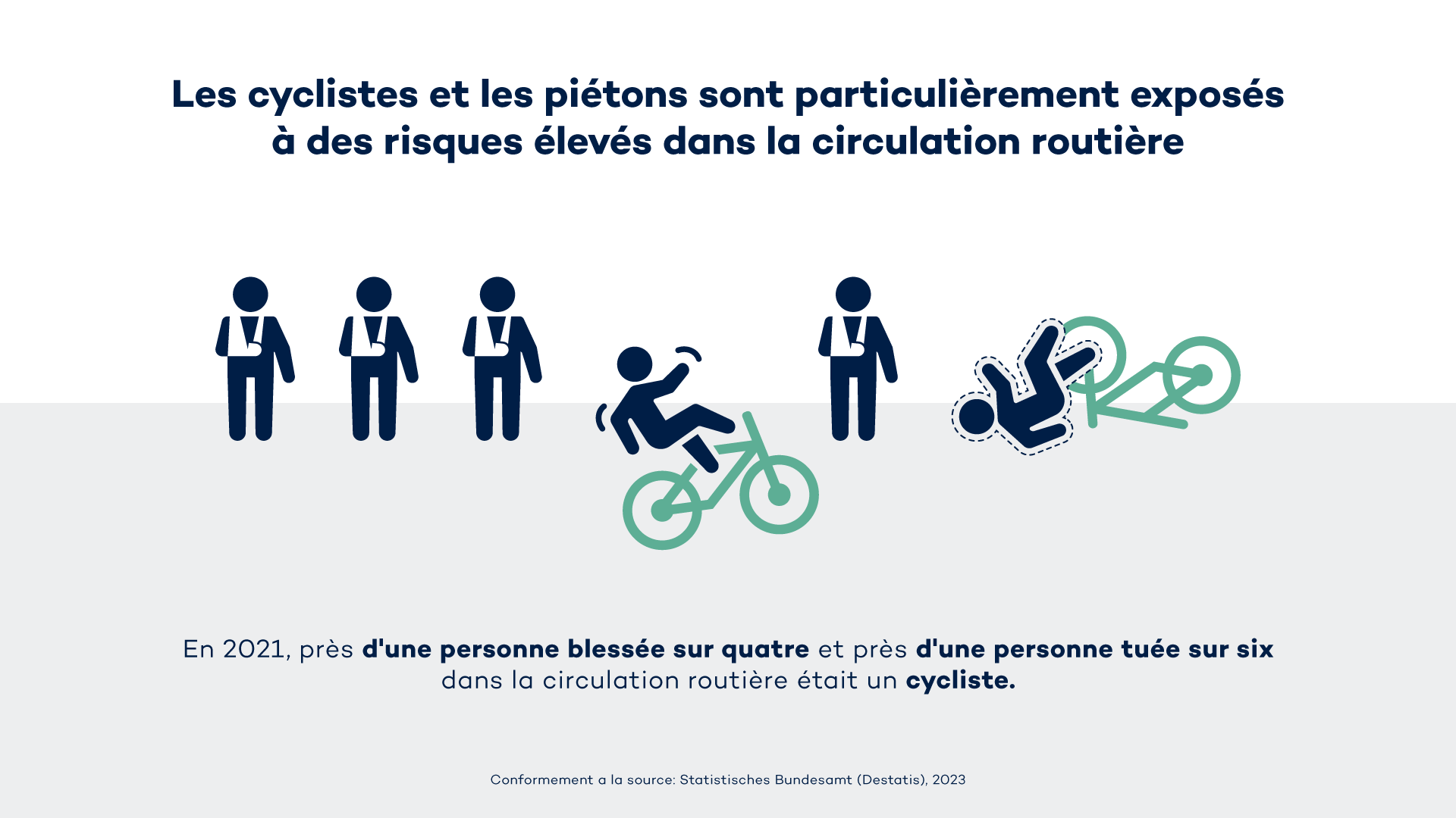 L'inconvénient de ce développement positif : des voies cyclables congestionnées et des embouteillages au niveau des feux rouges pour cyclistes. Les automobilistes sont submergés. De nombreux accidents impliquent des deux-roues, notamment dans les agglomérations où en moyenne 90 % des accidents de vélos entraînent des dommages corporels. Et la situation empire à cause des nouveaux types de véhicules plus rapides tels que les trottinettes électriques et les vélos à assistance électrique. Déjà, les vélos à assistance électrique et les vélos électriques représentent un tiers des décès à vélo. En raison de leur vitesse élevée, ces véhicules imposent un niveau d'exigences bien plus important sur leurs conducteurs, mais aussi sur les autres usagers de la route, tels que les automobilistes.