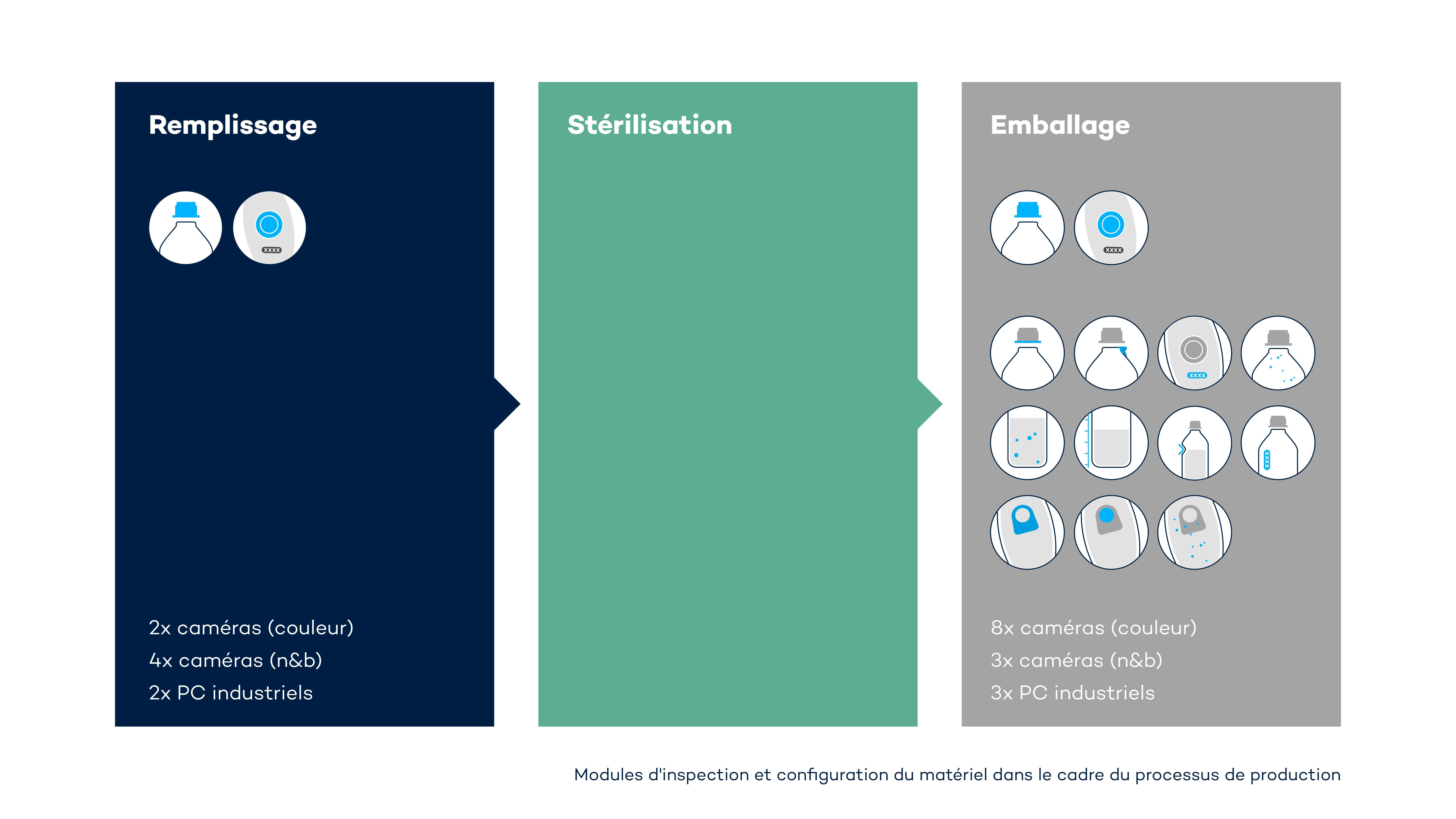 Dans la zone de remplissage, il est essentiel que la solution d'inspection soit totalement intégrée au système de remplissage, avec une seule interface de commande de la machine. Ainsi, tout récipient identifié comme étant défectueux peut être filtré avant même de quitter la zone de remplissage afin qu'il n'atteigne pas les zones de stérilisation et d'emballage en aval. Enfin, les différentes classes sont inspectées dans la zone d'emballage.