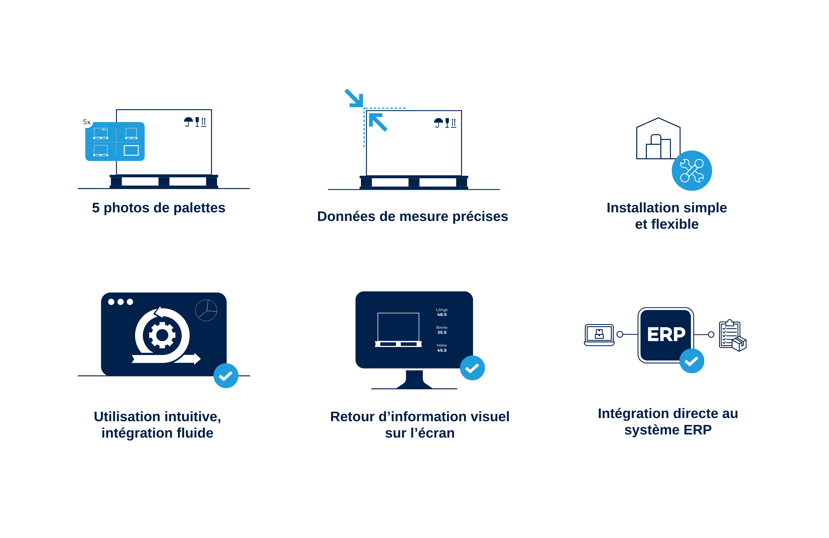 Le système de mesure précis des palettes permet non seulement d’optimiser l’utilisation de l’espace de stockage précieux et le chargement des conteneurs, camions ou autres moyens de transport, mais il optimise également les coûts de transport et prend en charge la facturation certifiée grâce au respect des exigences les plus strictes pour les mesures homologuées. La technologie de pointe relève le volume des marchandises et enregistre leur densité, maniabilité, stockabilité et responsabilité, ce qui permet des classifications plus précises.
