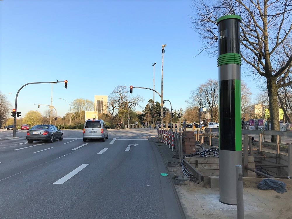 VITRONIC is testing its systems at a danger point. This concerns an intersection representing a highly congested traffic junction (K94) in the Hamburg city area. It is located only about two kilometers northwest of the central train station and near the CCH congress center. A video camera was installed on an existing light pole to record the flow of traffic coming from Schröderstiftstraße in the direction of the K94 junction (Rentzelstraße / Schröderstiftstraße / An der Verbindungsbahn). A second camera was fitted to a pillar located directly at the K94 junction.
