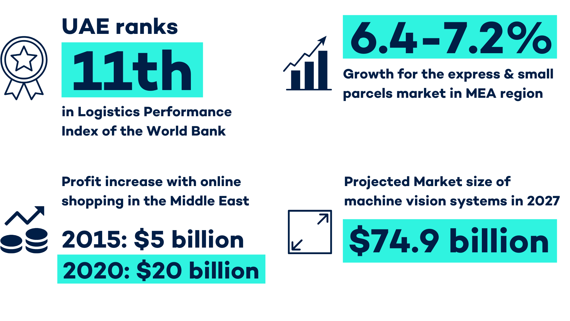 With new challenges and a striving global economy, the logistics sector in the MEA region is set to grow to meet the demand from rising economies in the region. With an increase in population and buying power, logistics companies in the Middle East and Africa region face new challenges and must adapt new technologies to be ready for the future. One of these technologies certainly is machine vision. While currently manpower is relatively cheap and many companies rely on it to handle their demands, this is not a suitable model for the future. The future of logistics demands more accuracy, faster response rates and an overall readiness to handle large amounts of goods. Companies that invest in the systems now can make sure to keep the pace of projected future demand and to stay on top of the list. Companies who fail to adapt however might be in the situation of not being able to maintain the market position they have now.