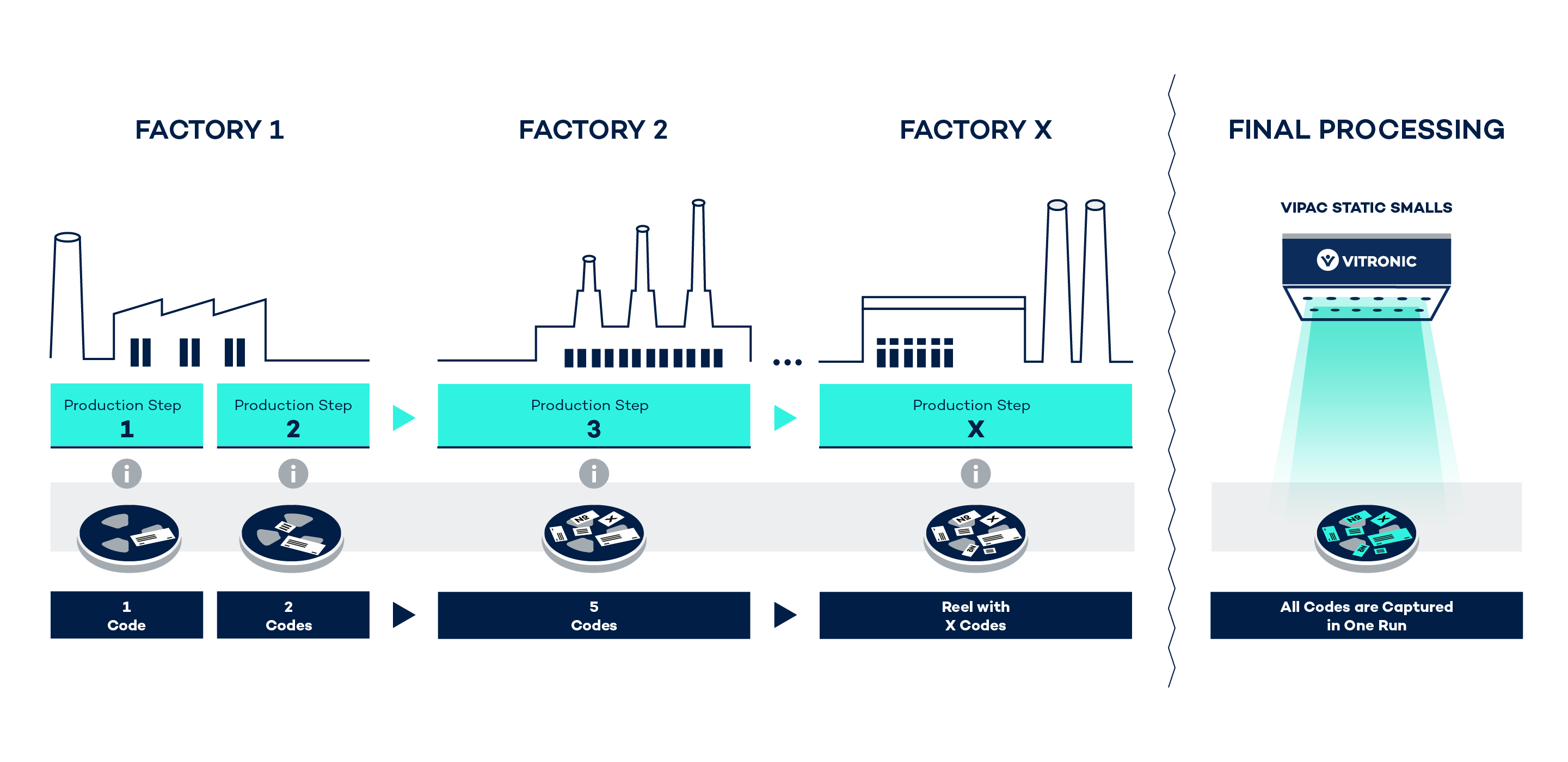 One solution for integrating the information is, for example, to document individual process steps in the supply chain with the help of additional barcodes. In the future, they will document more extensive information than before and must therefore also change - from one-dimensional barcodes to multi-dimensional data storage. If simple codes are used that can record little information, they must be available in very large numbers. This often leads to a high error rate during manual reading. If complex barcodes are used, special hardware is required.